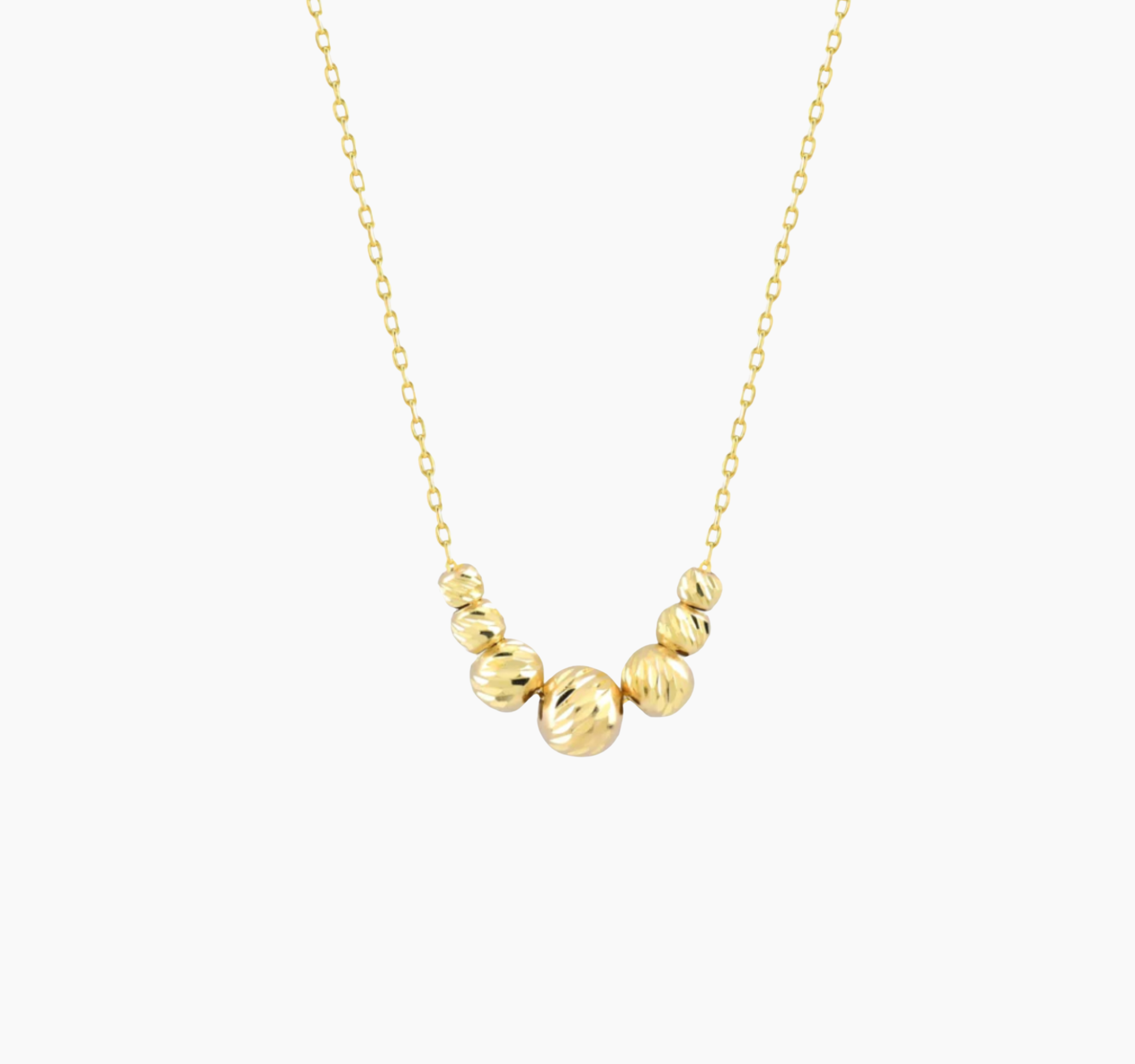 The necklace is a 14k solid gold, handmade piece featuring a minimalist and dainty design. It includes seven ball beads with a diamond-cut finish, strategically placed along the chain to create a “bead station” effect.